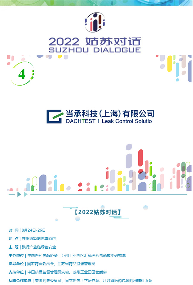 以“践行产业链绿色安全”为主题的“2022姑苏对话”活动将在苏州召开。本次活动关注国内外药包材法规与标准最新进展、绿色节约、供应链安全等热点,共享新思维、新理念、新信息。当承科技(上海)有限公司4号展位,期待与您的相遇!