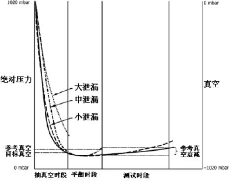 将包装容器置于特定的密封腔体内,对该密封腔体进行抽真空,达到设定的真空值后关闭真空阀,检测一段时间内真空度的衰变来判定包装容器是否产生泄漏。