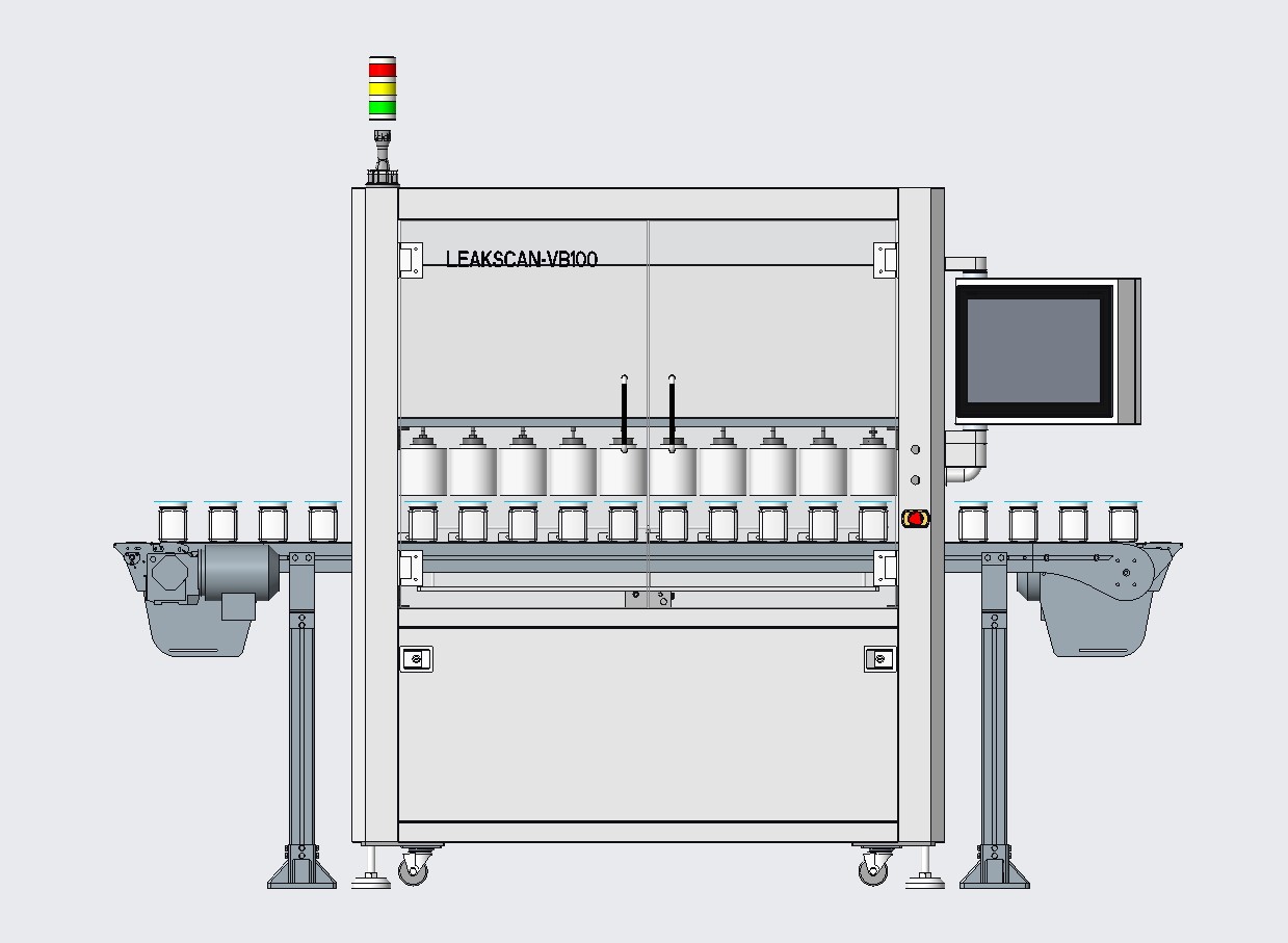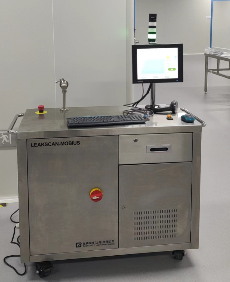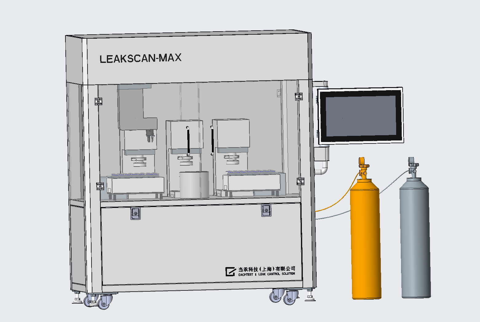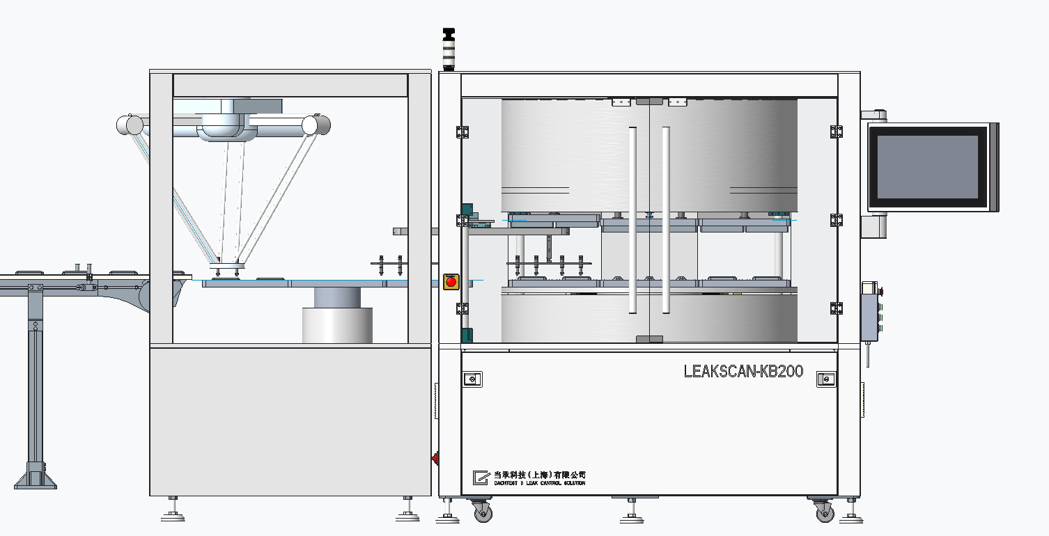 密闭的包装容器自动进行真空衰减测试,排除大漏与微漏(≥2um),继而样品被自动放入压力腔室,在压力腔内自动压氦,压氦完成后自动吹扫,吹扫后自动放入氦检腔内在真空条件下进行氦质谱极微漏测试;